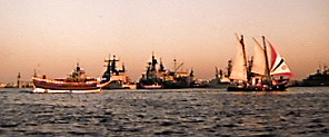 a replica of the Godspeed past the Norfolk Navy Base at sunset.