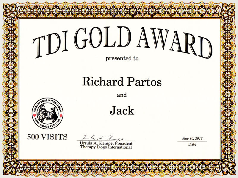 Well, after three obedience courses (beginner, sub-novice, and novice) Jack and I went to be evaluated, and, lo and behold, we passed with flying colors! Jack became a Certified Therapy Dog.